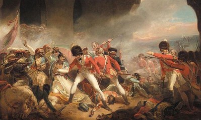 Erstürmung der indischen Stadt Shrirangapattana durch britische Truppen im Jahr 1799. Die Stadt war Hauptstadt des unabhängigen indischen Staates Myosore, der sich gegen die britischen Kolonialbestrebungen wehrte. Im dargestellten vierten „Myosore-Krieg“ verlor der Staat seine Unabhängigkeit, der Herrscher Tipu Sultan wurde getötet. Ausschnitt aus einem Gemälde von Henry Singleton, ca. 1800.