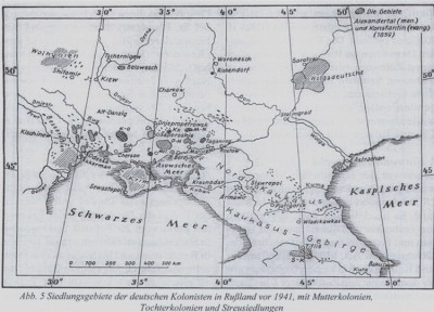 Abb. 1 Kompakte Siedlungsgebiete der deutschen Kolonisten in Rußland vor 1941 mit Mutterkolonien, Tochterkolonien und Streusiedlungen. Quelle: Landsmannschaft der Deutschen aus Rußland e. V. aus Heimatbuch der Ostumsiedler 1955, S. 16a