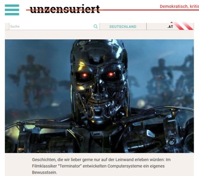 Um keinen Zweifel aufkommen zu lassen, wie gruselig das sei, macht der Artikel mit einem Portrait des Film-Fieslings „Terminator“ auf.
