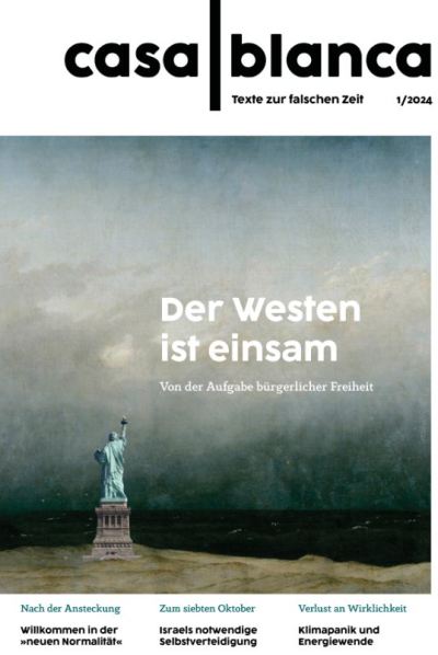 Den Nachweis dieses nun wirklich nicht mehr zu leugnenden Zusammenhangs liefert die jüngst neuerschienene und ca. 140 Seiten umfangreiche politische Halbjahreszeitschrift „casa/blanca“ (1/2024) mit dem vielsagenden Untertitel „Texte zur falschen Zeit“ und dem Schwerpunktthema „Der Westen ist einsam. Von der Aufgabe bürgerlicher Freiheit“. Könnte man den ersten Teil des Titelthemas noch etwas flapsig mit „Selber schuld, das hat er sich redlich verdient!“ kommentieren, ist jedoch seitdem ganz konkret eine Situation herangereift, in der sich das weitere Schicksal radikaler Gesellschafts- und Ideologiekritik entscheidet. Dabei stößt der Entschluß gerade jetzt in die Offensive zu gehen, Position zu beziehen, publizistisch Einfluß zu gewinnen, internationale Kontakte auszubauen und links wie rechts diskussionsunwilligen, kategorial abgestumpften und abgewirtschafteten Platzhaltern der „Zeitenwende“ noch energischer als bisher Konkurrenz zu machen, geistes-, ideengeschichtliche und kulturtheoretische Probebohrungen auf den Weg zu Selbstbewußtsein und Freiheit zu bringen, zwar naturgemäß auf nur wenig Gegenliebe. Dennoch muß der Versuch unternommen werden „zu begreifen und das heißt: auf den Punkt zu bringen, was gegenwärtig geschieht und wie sich die Wirklichkeit durch das, was geschieht, verändert. Solche „Texte zur falschen Zeit“ werden in „casa/blanca“ künftig erschienen“, liest man dazu im Editorial der Redaktion.