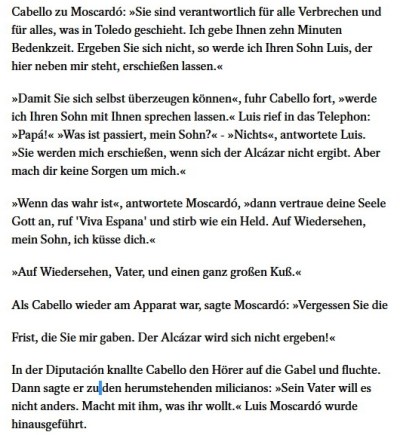 Solche Menschen lassen sich und ihren Stamm lieber von der Kavallerie niederschießen als sich in ein Reservat umsiedeln zu lassen. Andere knieten nicht nieder vor den Altären eines neuen Gottes, sondern steckten lieber den Missionar in den Suppenkessel. Der rechte Kommandant José Moscardó der umzingelten Festung Alcázar im spanischen Bürgerkrieg kapitulierte 1936 nicht, obwohl die linken Belagerer seinen Sohn als Geisel hielten, ihn zu erschießen drohten und dann exekutierten.