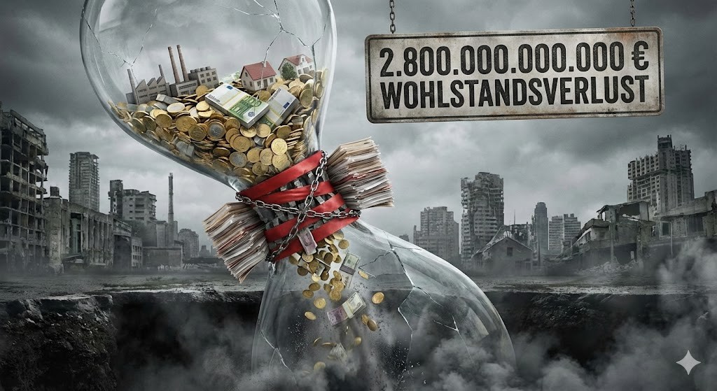 Das ist der perfidere Teil. Er beschreibt den Wohlstand, der hätte entstehen müssen, aber durch staatliche Intervention verhindert wurde. Wäre die deutsche Wirtschaft lediglich im historischen Normalmaß (2–3 %) gewachsen, statt in Rezession und Stagnation zu versinken, wären die Einkommen höher, die Unternehmensgewinne stabiler und die Vermögen größer. Dieser Betrag fehlt Ihnen nicht, weil man ihn vom Konto abgebucht hat. Er fehlt, weil er nie entstehen durfte. Es sind die Zinsen, die Sie nicht bekamen. Die Gehaltserhöhung, die die Inflation fraß. Die Investition, die unterblieb.