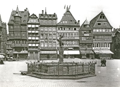 Römerberg mit Gerechtigkeitsbrunnen von Joh. Hocheisen und Ostzeile. Die Ostzeile des Platzes wurde im Zweiten Weltkrieg zerstört und in den 1980er Jahren nach alten Vorlagen wieder aufgebaut.