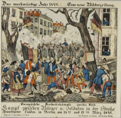 Die revolutionäre als eine praktisch-festliche Erfahrung besagt: „Wir können selbst“: „Kampf zwischen Bürger u. Soldaten in der Straße Frankfurter Linden in Berlin, am 18ten und 19ten März 1848“